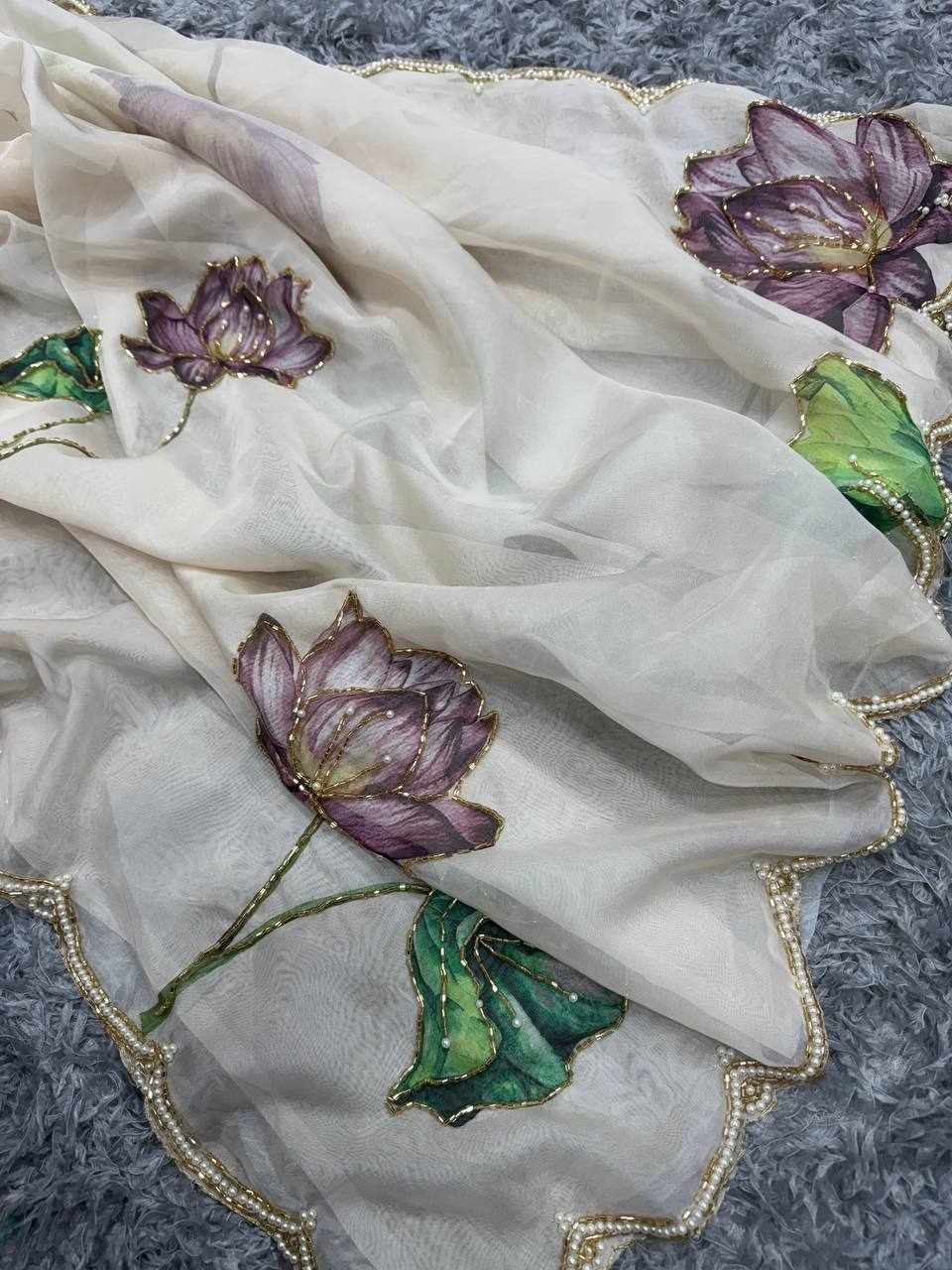 NC 5386 Soft Organza White Beautiful floral print Saree