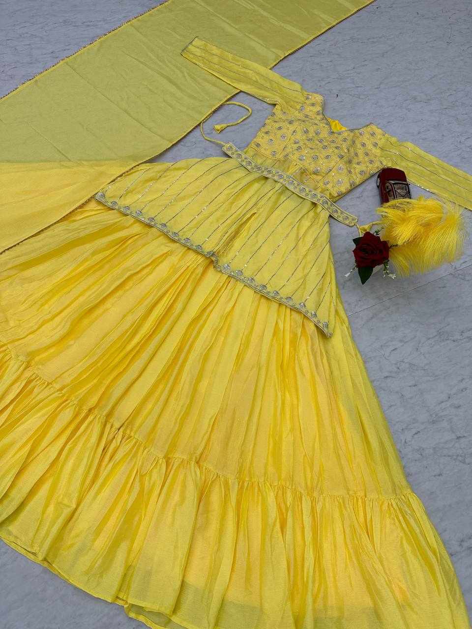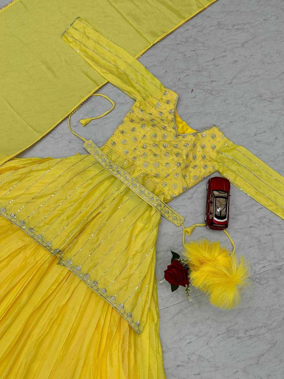 Name : Pc 434 Yellow Chinon Sequence Work Lehenga